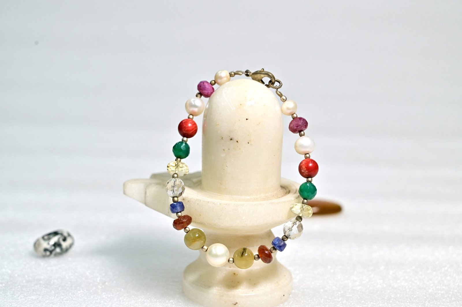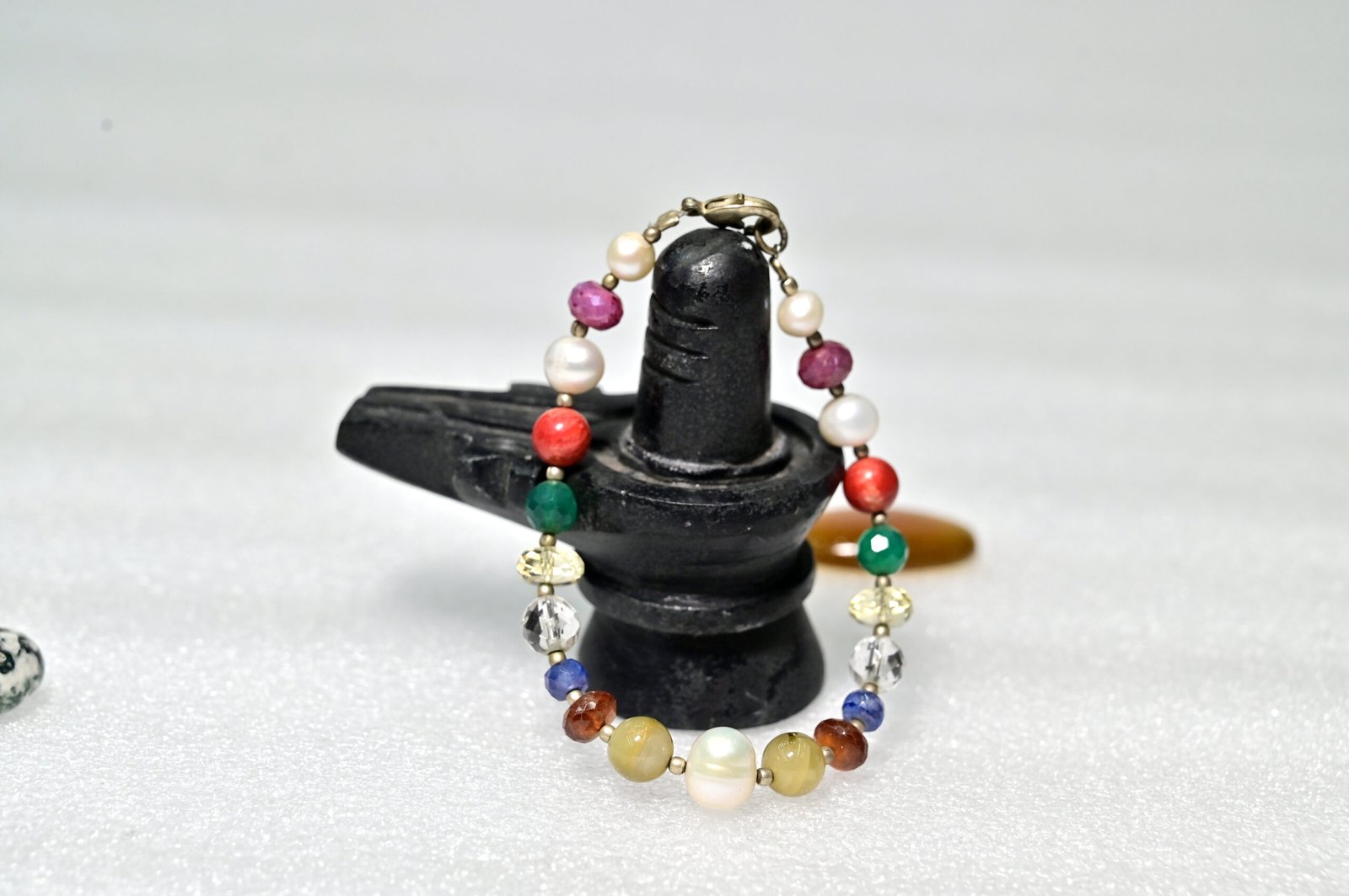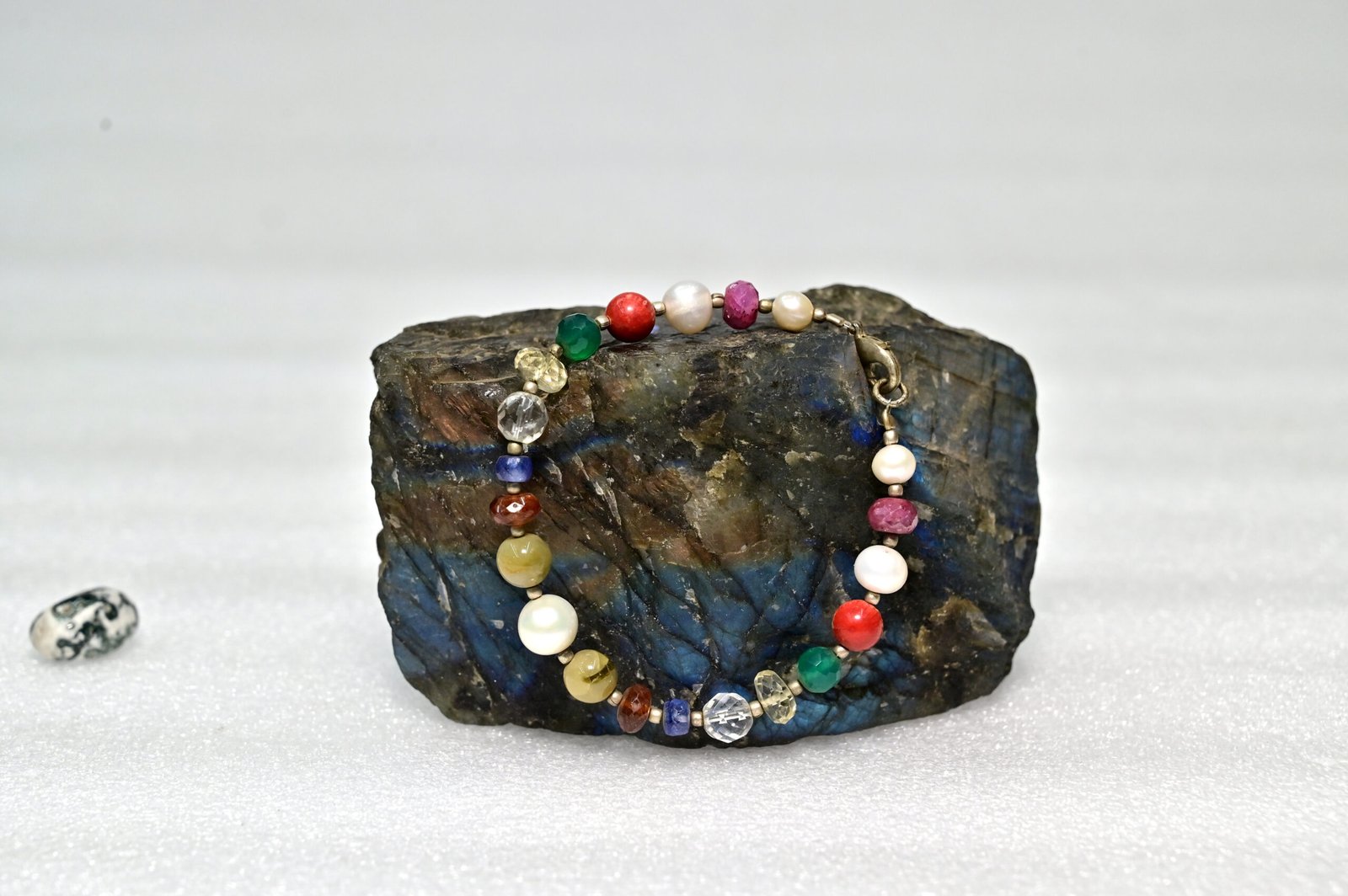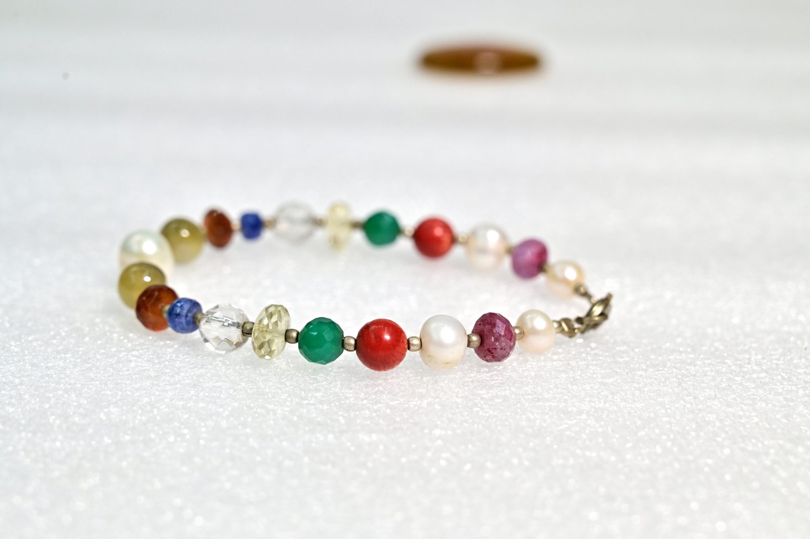 Achieve harmony and prosperity with our 9 Gems Astrological Bracelet. Crafted with precision, this meaningful accessory features nine exquisite gemstones, each symbolizing one of the nine planets in Vedic astrology.