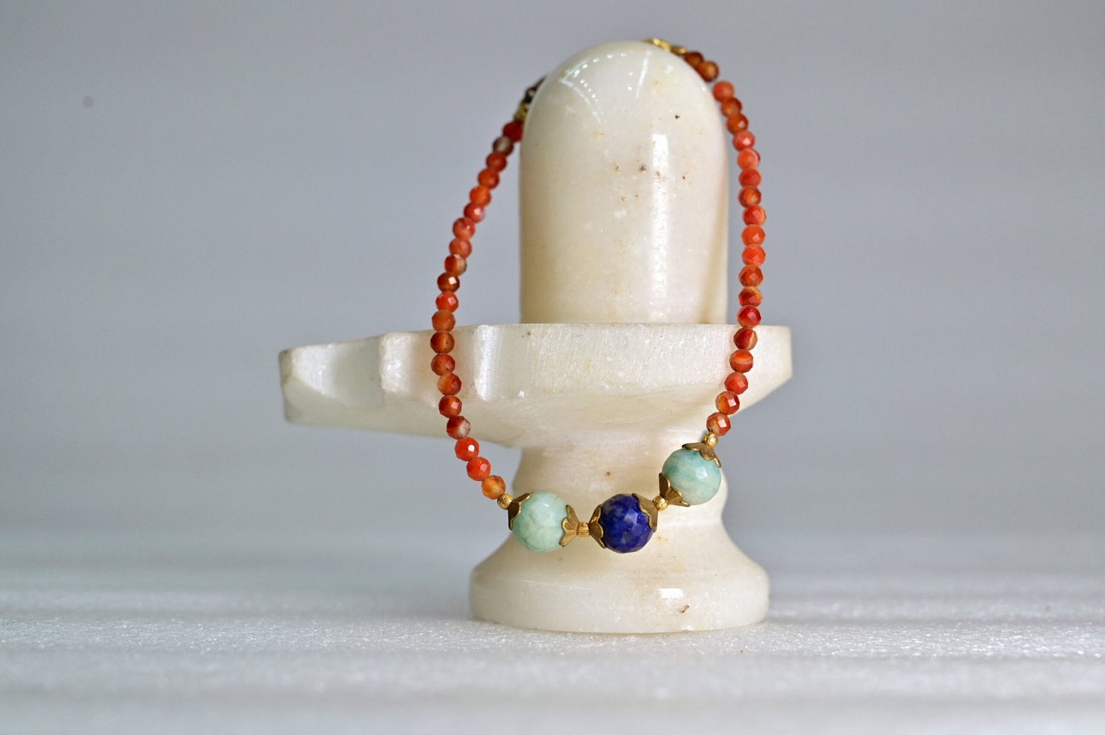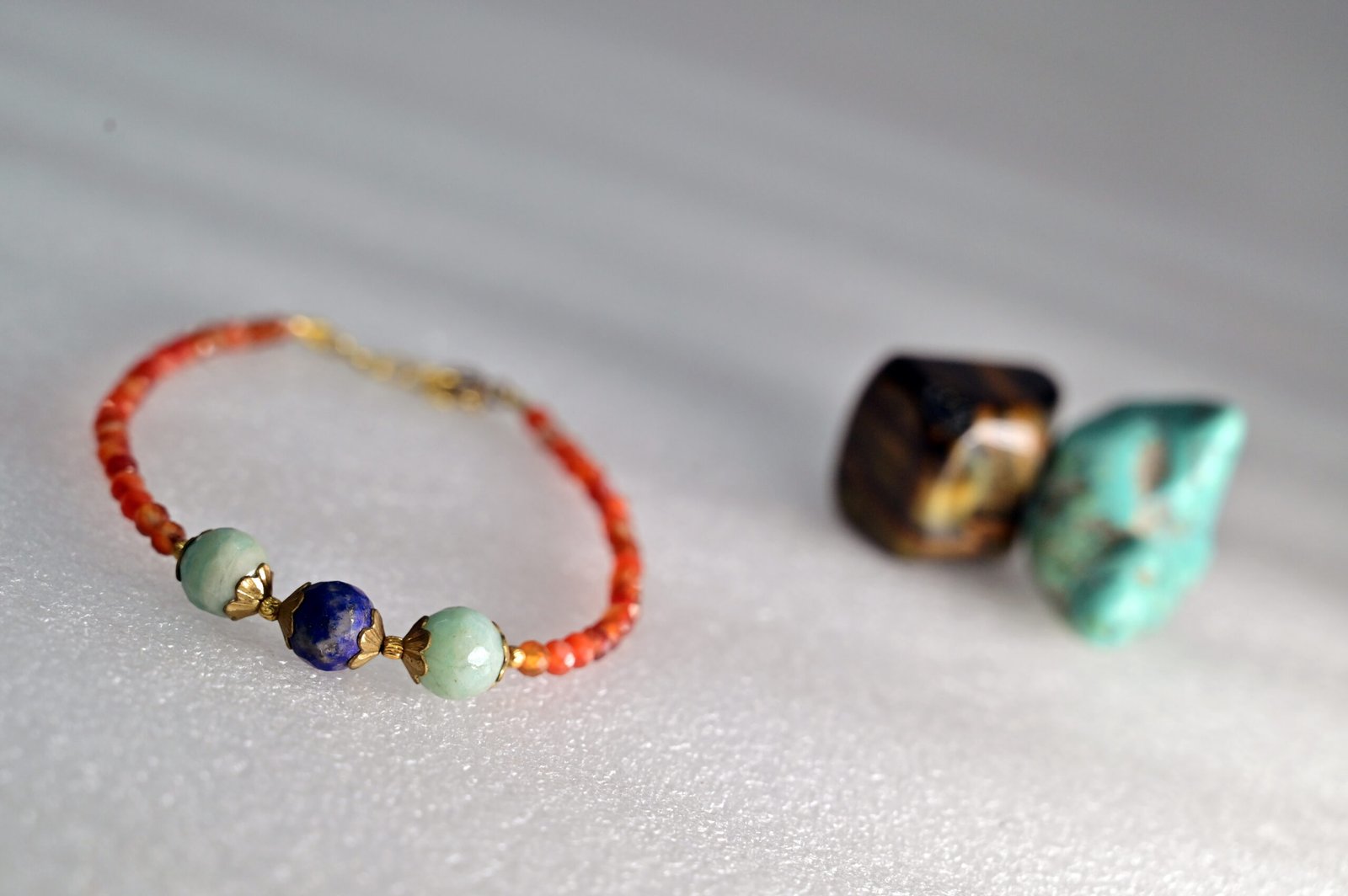 This bracelet is crafted with Carnelian, Amazonite, and Lapis Lazuli—three stones known for their exceptional qualities. Carnelian enhances motivation and courage, helping you face life’s challenges with confidence. Amazonite promotes emotional harmony, helping you express yourself more effectively. Finally, Lapis Lazuli fosters wisdom and mental clarity, making it ideal for professionals and students alike.