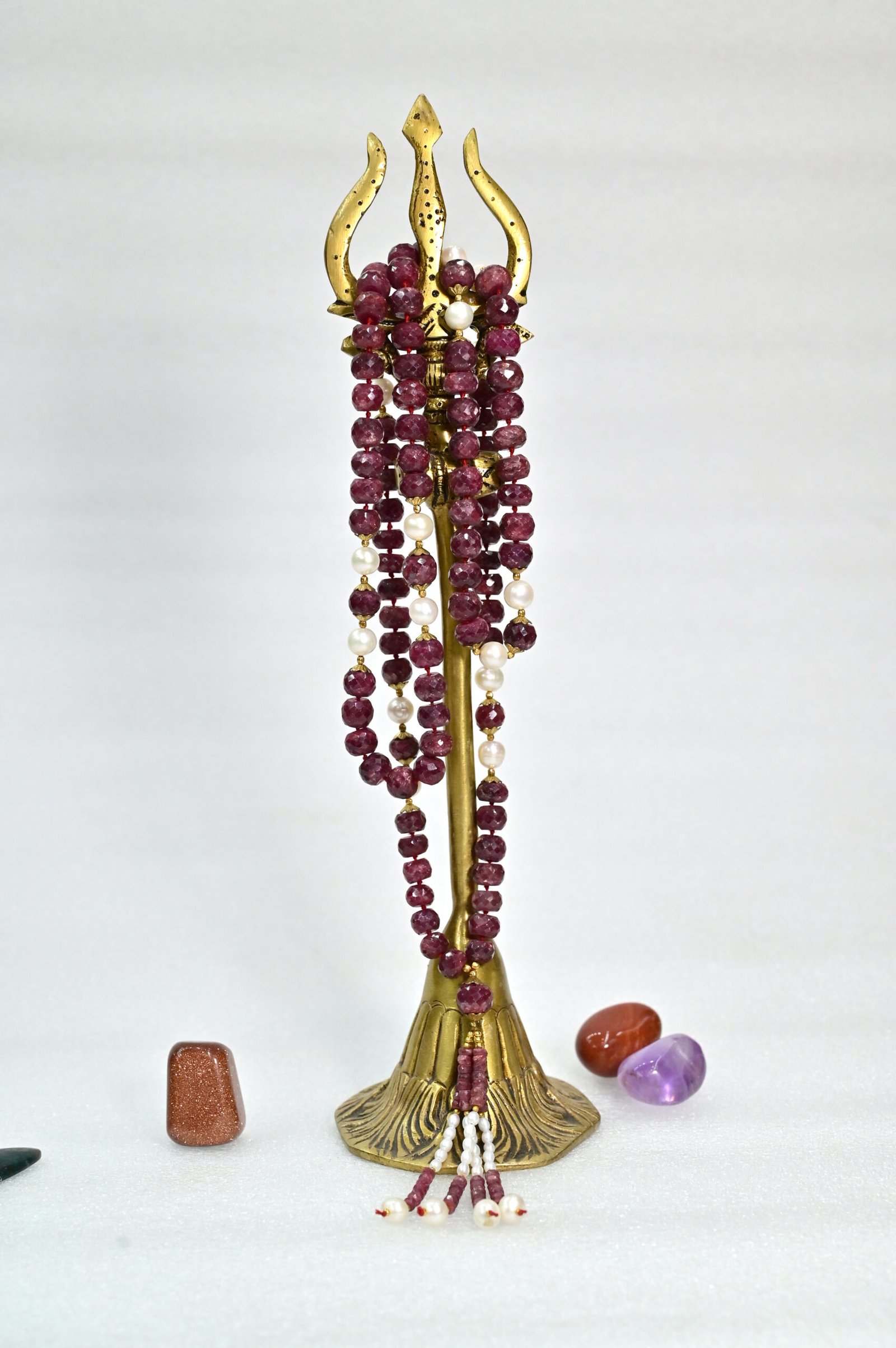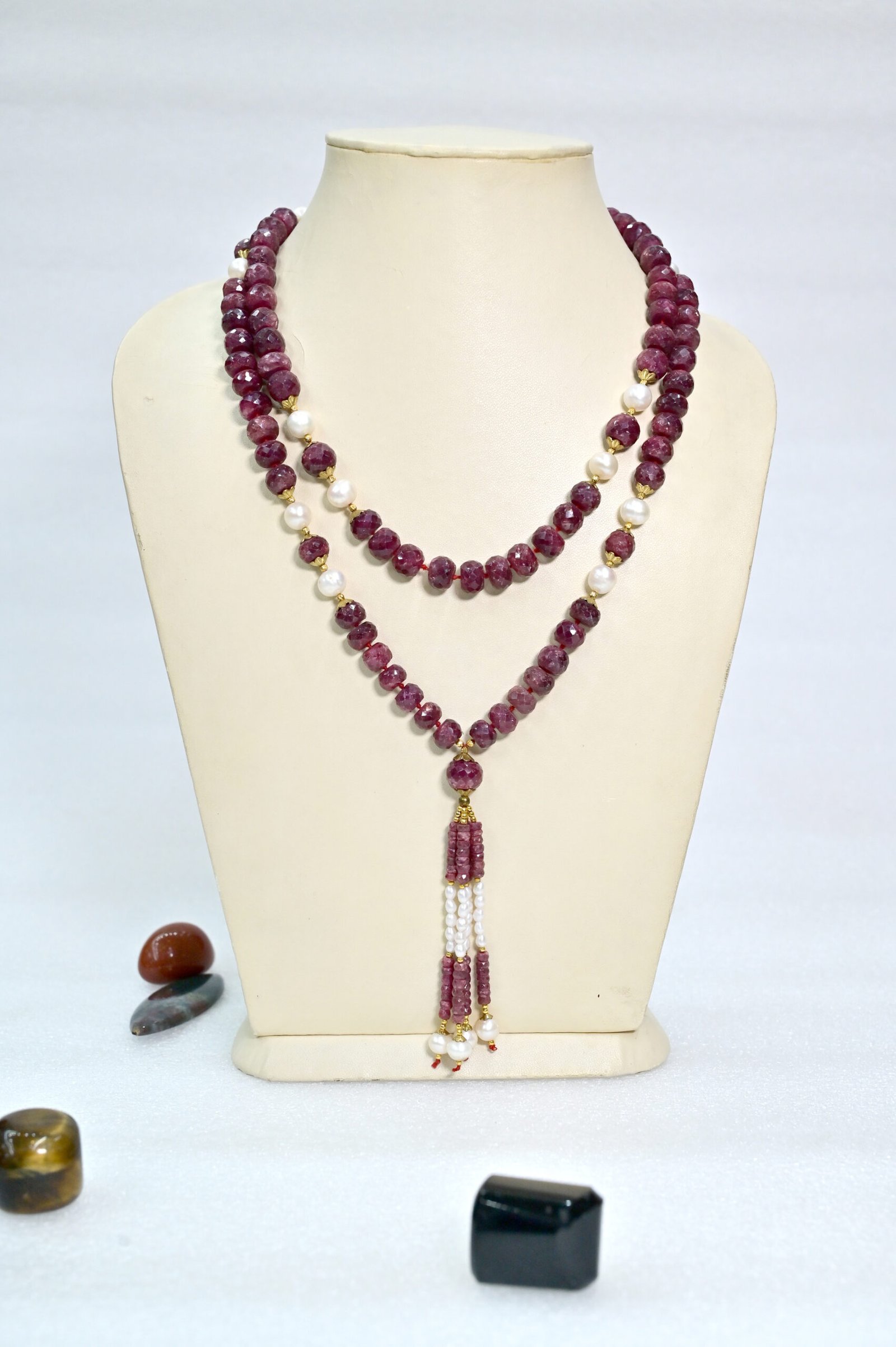 Luxurious Ruby with Pearl Mala symbolizing power, purity, and prosperity.